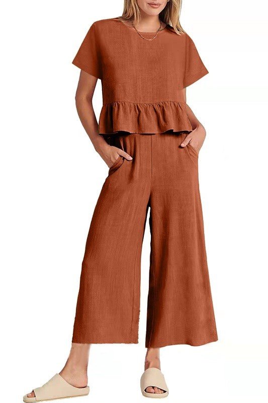 Double Take Full Size Texture Round Neck Ruffle Sleeve Top and Shorts Set