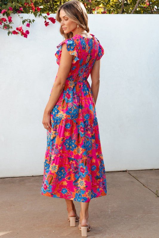 Kamari Boho Floral V Neck Ruffle Tiered Long Dress