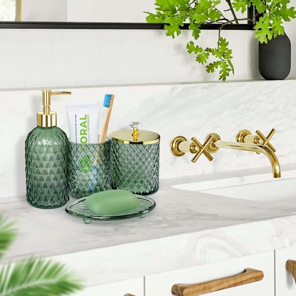 - DECORATIONS FOR HOME APARTMENT / BATHROOM -- The sage glass bathroom set is ideal decoration fits various styles: bathroom decor, industrial style, western decor, modern style, contemporary decor, and country decor. Ideal bathroom accessories set for home decor, bathroom decor, and farmhouse decor. Great for the kitchen and bath, for countertop organize, vanity top, makeup table, and craft