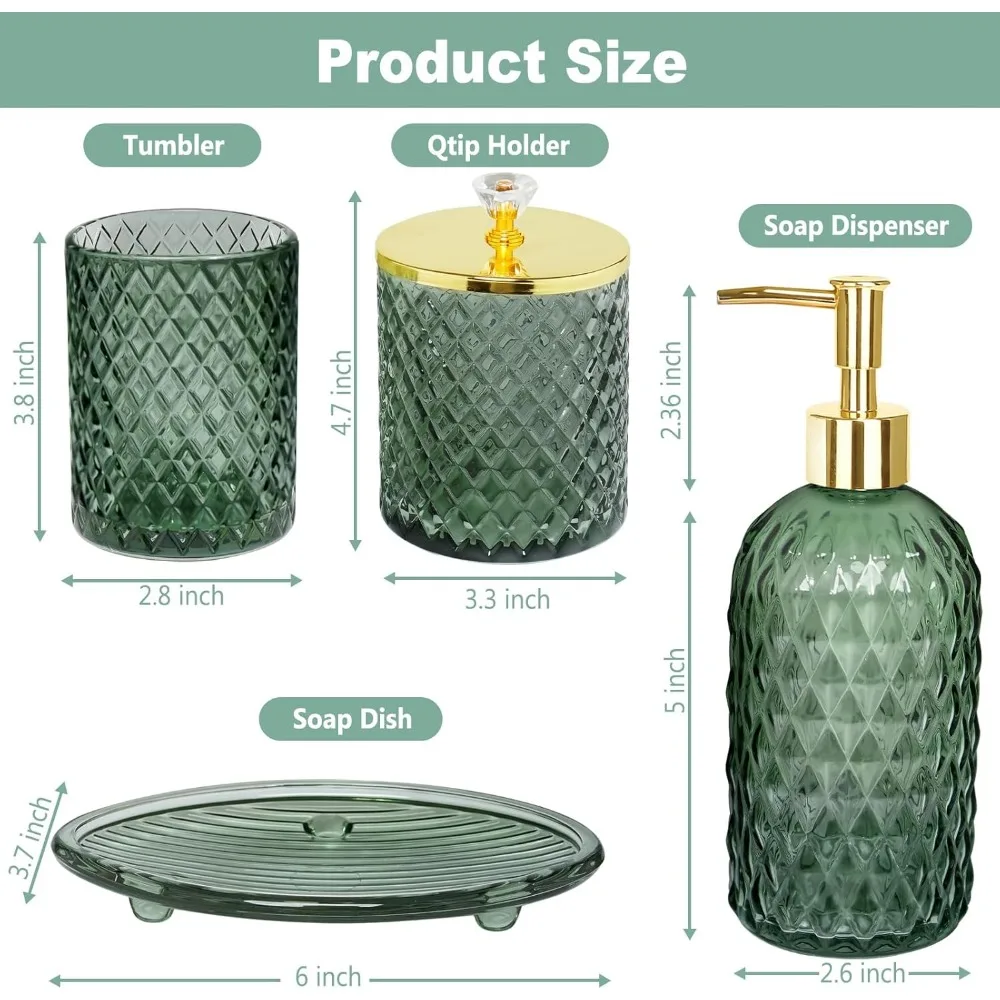 - MULTIFUNCTION SAGE GREEN GLASS BATHROOM ACCESSORIES SET -- 4 pieces bathroom set includes a Lotion Soap Dispenser, a Soap Dish, a Qtip Holder, and a Toothbrush Holder, Perfect for storing your toiletries or your cosmetics, the green tray can also hold your jewelry and keeping your bathroom counter fully organized and neatly