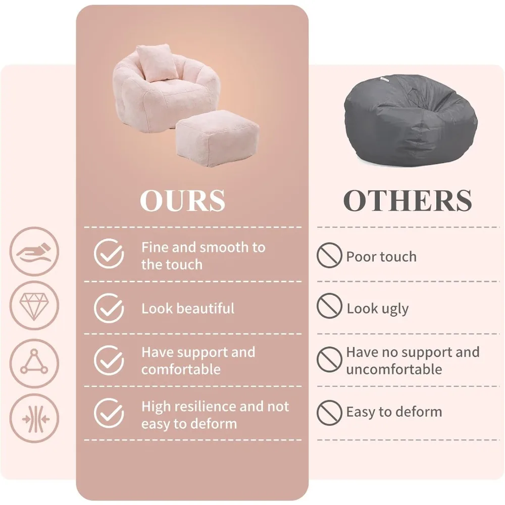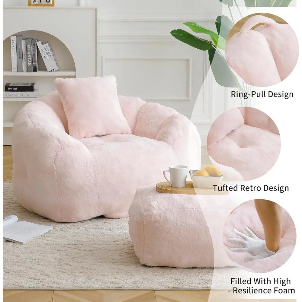 Bean Bag Chair for Adults, Faux Fur Upholstered Beanbag Chair with Shell-Shaped Design, Comfy Bean Bag Sofa with Pillow and Foot