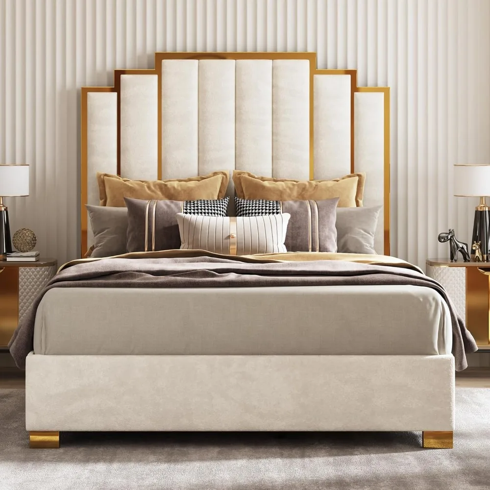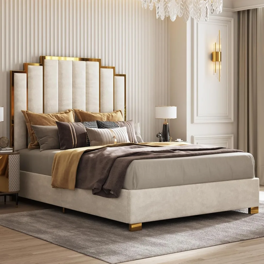 Queen Size Upholstered Bed, Modern Velvet Bed Frame with 61.4” Tall Gold Trim Headboard, No Box Spring Needed, Cream
