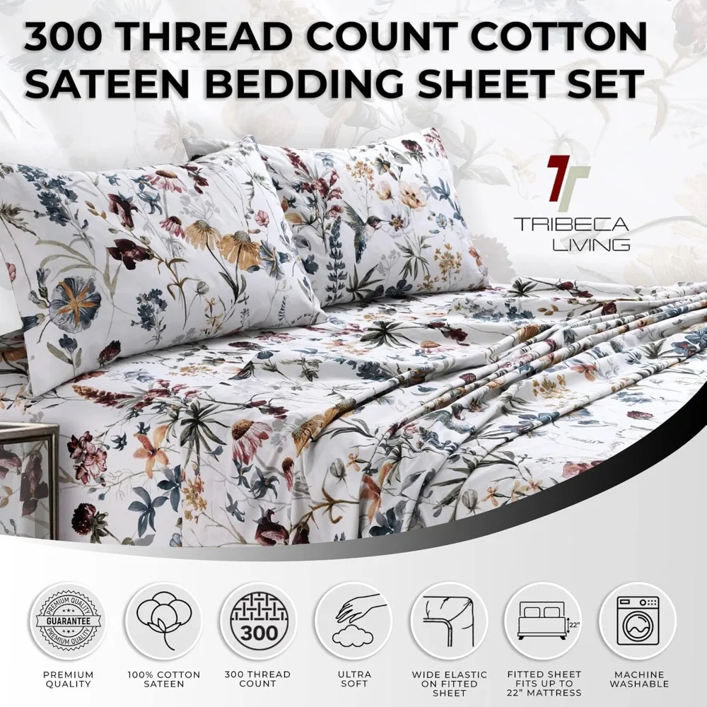 Tribeca Living Queen Bed Sheet Set, 300 Thread Count Soft Cotton Sateen, Floral Print with Extra Deep Pockets, 4-Piece Bedding S